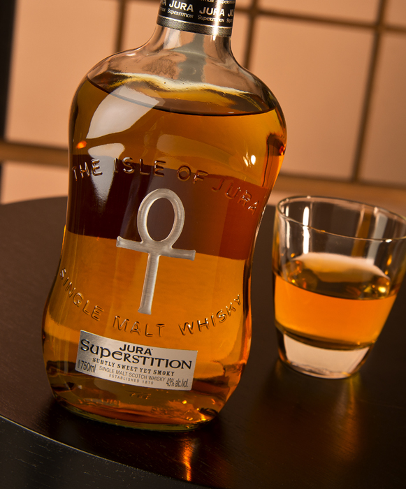 Jura Superstition –  If you travel to the remote Isle of Jura off the west coast of Scotland, you will hear tales of strange customs and legends.  The bottle containing this fine malt is decorated with the ancient Ankh symbol which is rumored to bring good fortune, especially if you wear your lucky socks .  I can assure you at least of good tastings if you pour a dram of this spicy and lightly peated whisky…so maybe the Ankh is a good omen.  The rocky soil and heathery peat each contribute to the subtle flavors of honey and a crisp woody note .  Neat is the only way to appreciate this special single malt and you might want to avoid any black cats or full moon evenings for your first taste.  I found that the finish was long and sweet with a slight smokiness .  Highly recommended with an 8.5 rating , just not on  Friday the 13thJura B-postLR