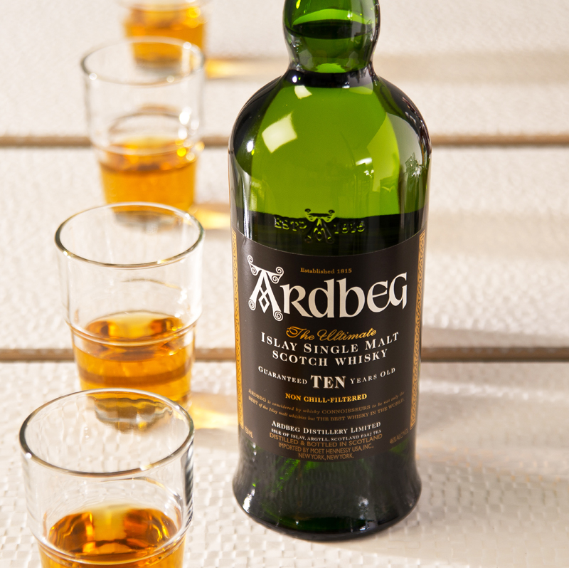 Ardbeg 10- As our world begins the inevitable return to near ice age conditions…….seek warmth this evening. A gigantic smoky wallop is what you will get with this powerful dram from Islay. Embrace the outdoor cold and revel in the warmth of this massive dram. Pouring the rich golden liquid will immediatly fill the surrounding air with tremendous smoke and peat, nothing subtle here . Get your nose right into the glass to enjoy the full intensity of this monster. I taste the earthy goodness that the distillers infused the whisky with and possibly some dried fruit as well. All this fire and brimstone is however nicely softened by the caramel and honey notes that carry the complex flavors to a fine warm and rather lengthy finish. This is a full bodied and ultra rich malt , not for the delicate of palate . Remember the last campfire you enjoyed with friends ? This scotch will bring back that memory each time you pour a glass and warm you just as nicely, without the sooty mess on your plaid sweater! Snobbishly rated a 7.5 for most, but add a point if you are a peat lover. Three cheers for the smoke.